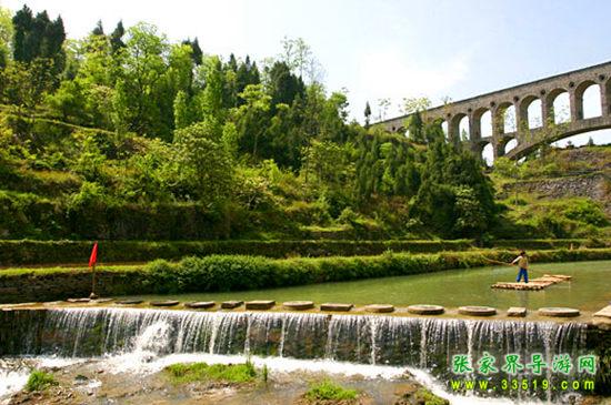 寨前阡陌縱橫,溪流交錯,九曲迂回,水邊是排排水車、石碾,水里是整塊整塊的天然青巖板,出水為洲,入水為瀑,并形成許多奇特階梯瀑,水上是一道道巖板堰,堰上是一道道形態(tài)各異的跳巖,水溝上橫著塊塊巨大的巖板橋……山水田園與水車、水碾、巖板堰、巖板橋、跳巖相互輝映,構(gòu)成一幅幅絕妙畫卷。