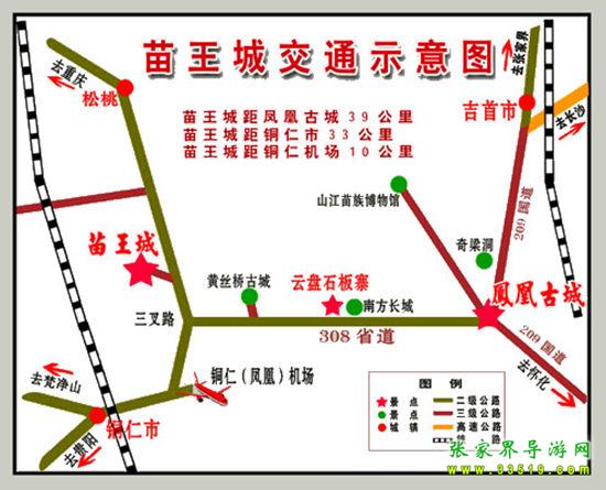 2、銅仁方向:自銅仁火車站往湖南方向經(jīng)過銅仁鳳凰飛機場附近(20公里處)、三岔路(23公里處)、蔬菜基地百合基地(26公里處)、中國苗王城牌樓(30公里處)、苗王茶園(30公里處)、苗王城生態(tài)農(nóng)業(yè)觀光點(桃林、金果林)、苗王城停車場售票處(33公里處)。