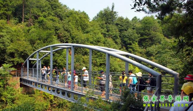 這是一座鋼棧橋,全長23.8米,凈跨20.4米,寬1.9米。下梁是兩根鋼質工字梁,上梁是兩根鋼管拱梁,鏈接兩根工字梁的次鋼梁14根,水平鋼管5根。殼體小巧玲瓏,連接兩座結構復雜的山峰,構成一道離奇絢麗的連心景觀。