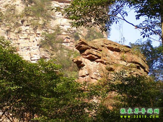 密林中有兩塊石頭,很像兩只龜重疊在一起,探頭探腦的樣子,正向著金鞭溪爬去。有人說這是“夫妻雙雙把家還”。這兒有一個荒誕的故事:億萬年前的一個晚上,海龍王通知居住在這一帶的蝦兵蟹將及所有手下,明天天一亮海水就要消退了,必須全部及時撤走。這兩只情龜只顧著花前月下,把海龍王的話當(dāng)耳邊風(fēng),第二天早上起床,望著海水已經(jīng)遠(yuǎn)遠(yuǎn)地退去了,后悔莫及。他們爬呀爬,只希望有一天這溪水能把他們帶回大海。有的人有不同的“版本”:這兩只龜藏在這深山老林干什么呢?為了躲避“計劃生育”。張家界像烏龜?shù)?hellip;峰很多,那都是它們干的好事呀!