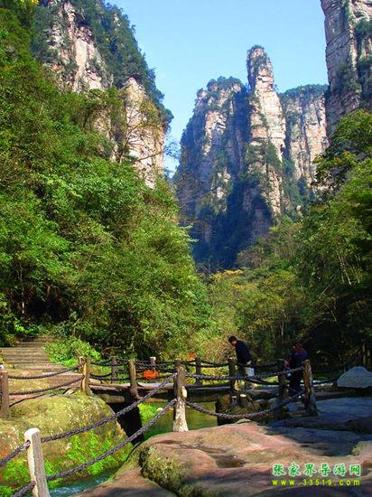 金鞭溪因流經(jīng)金鞭巖而得名,全長5700米,穿行於絕壁奇峰之間,溪谷有繁茂的植被,溪水四季清澈,被稱為“山水畫廊”、“人間仙境”。有詩贊曰:“清清流水青青山,山如畫屏人如仙,仙人若在畫中走,一步一望一重天”。途中你會看到點歌臺,那里有土家姑娘時刻準(zhǔn)備為游人唱民族歌曲,只要付十元錢她們就會為你引吭高歌,當(dāng)然,如果你不想花這個錢,也可以在一邊聽聽別人點的歌,聽完后走人。