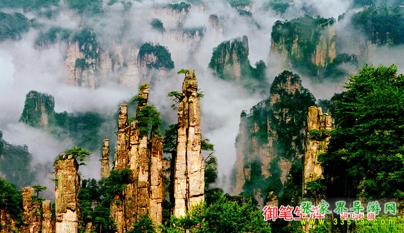 眼前這幾支細(xì)細(xì)瘦瘦的山峰,好像一支一支、一節(jié)一節(jié)地從這個峽谷中長出來的一樣,形狀很像一排倒插在筆筒中的毛筆。筆尖、筆桿可以分得清清楚楚,尤其是頂部一些不大不小的松樹,剛好像是毛筆的筆毫!這簡直就是出自能工巧匠之手!山長成這樣子多么不容易啊,它經(jīng)過億萬年流水切割、風(fēng)雨侵蝕、重力崩塌等多種復(fù)雜的地質(zhì)作用才最終形成。除了大自然,誰有這樣的匠心和耐心,對堅硬如鐵的石英紗巖進(jìn)行這樣的精雕細(xì)刻?有人說,張家界如詩如畫的風(fēng)景,就是這幾支筆以青山綠水為線條,以風(fēng)花雪月為色彩,以時間空間為畫紙畫出來的。