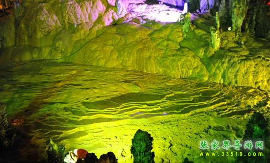 現(xiàn)在所看到的這座小山被稱為“水晶山”,這就是水晶宮的得名由來,科學(xué)名稱稱它為“底流石”,那么它的形成年齡為十五萬年,因為洞頂是一座高山,其地表水匯集成溪沿著洞頂?shù)目p隙滲漏下來,在水沖的過程中,方解石和次生碳酸鈣的沉淀而形成,那么一下大雨以后,就有水這樣流下來,形成瀑布,我們把這個地下又稱為“石瀑布群”,大家一定早就注意到這上面金光閃閃的東西了,根據(jù)科學(xué)鑒定這是含某種磷元素的方解石結(jié)晶體??雌饋黹W閃發(fā)光,它的特點就是冬天洞里干燥,它就特別亮,夏天洞里潮濕它就特別暗淡,如有水這樣流下來時,就看不到了。