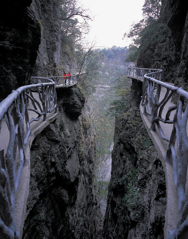 站在棧道上俯瞰群山,古人“會(huì)當(dāng)凌絕頂,一覽眾山小”的感覺(jué)油然而生。由于天門山是國(guó)家森林公園,植被特別豐富,加上典型的喀斯特地貌,所以,在這條棧道上更能找到一種在乘坐直升飛機(jī)飛越熱帶雨林大峽谷的感覺(jué),這平時(shí)只能在電影里看到的場(chǎng)景,在這里能讓你身臨其境。