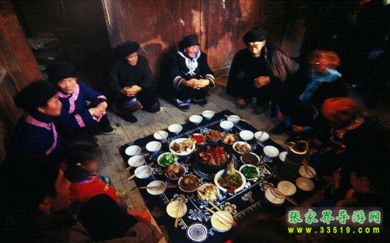 土家人趕年時(shí),先把菜全部上桌后,再盛一碗飯,加一些葷菜,飯碗上放一雙筷子,那時(shí)土家人先祭拜他們的祖先,然后家人上桌開始趕年。土家人年餐菜都必須是自家養(yǎng)的和自家產(chǎn)的,自家養(yǎng)的如豬、牛、羊、魚等,自家產(chǎn)的如紅薯粉、黃豆、青菜等等。