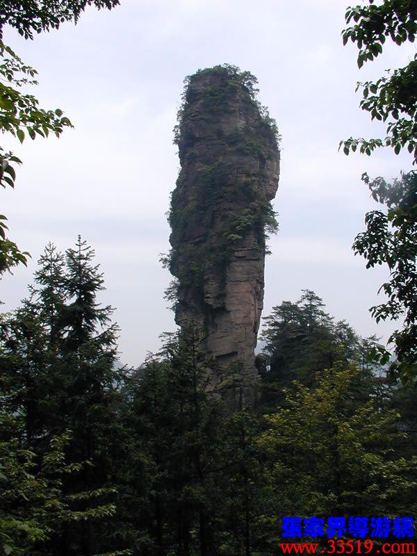 (南天一柱)現(xiàn)在我們前方幽谷峰林中有一高達200多米的孤峰,宛如擎天玉柱。上部灌木點綴,中部巖身赤裸,下部樹木遮掩,峰體渾圓、偉岸,因立南天門下而得名?!?/p>