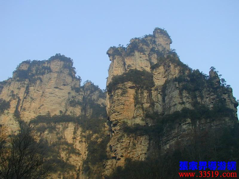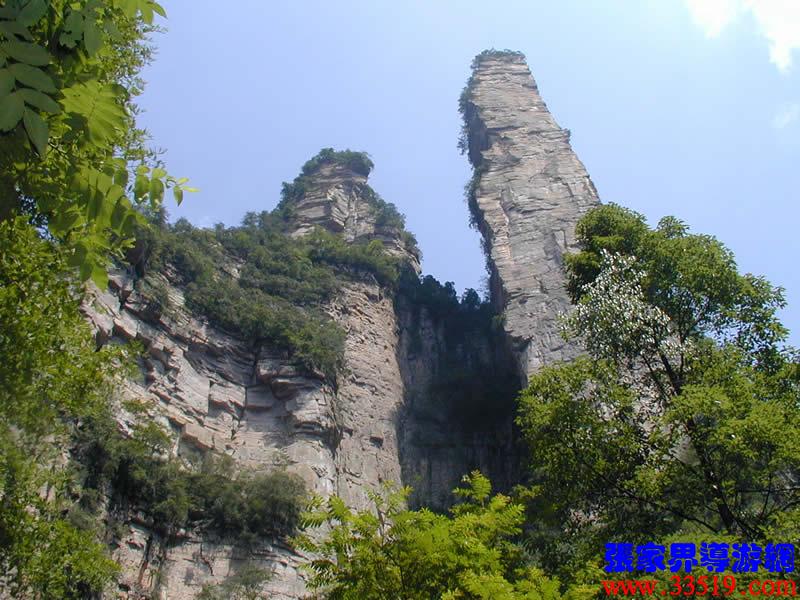 (金鞭巖、神鷹護(hù)鞭)如果要問(wèn)張家界國(guó)家森林公園的標(biāo)志景點(diǎn),答案是現(xiàn)成的:金鞭巖。早在清代中期,一些文人就把張家界的峰林及百丈峽列入“永定八景”。其一叫“危峽啼猿”;其二叫“層巖涌塔”:“縣西二十里青崖山,其前五山并立,層峙如浮圖。中一峰更峻拔,上插宵漢,晴輝雪積,最擅奇觀。”這里說(shuō)的“其中一峰”,指的金鞭巖。八大景點(diǎn)張家界占其二,可見先人是有眼力的。金鞭巖相對(duì)高度380多米,拔地而起,直插云霄,無(wú)論你遠(yuǎn)看近看,正看側(cè)看,都是一根刺破青天的長(zhǎng)鞭!在金鞭巖左側(cè)的那座巖峰,大家看多像一只兇猛的老鷹,勾嘴瞪眼,雙翅略展,時(shí)刻警覺(jué)地守護(hù)著金鞭,人稱“神鷹護(hù)鞭”。