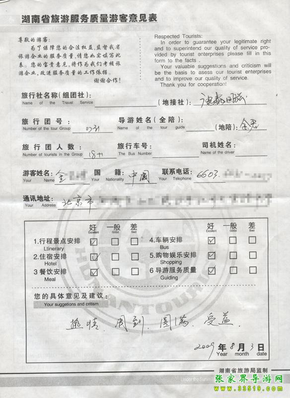 2009年7月31日北京金先生一行19人接待質量反饋單: