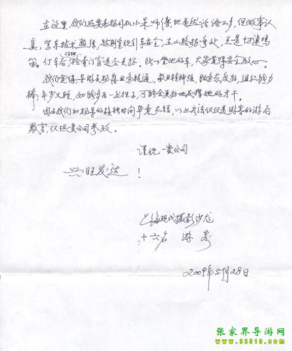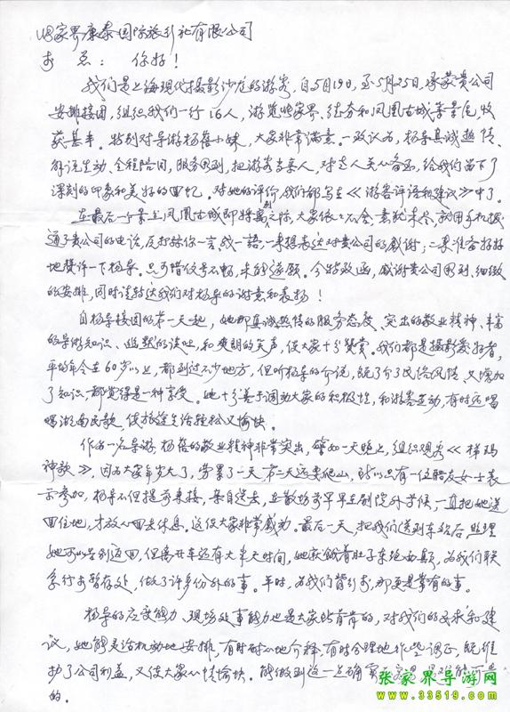 2009年5月19日“上海現(xiàn)代攝影沙龍”一行16人,參加張家界旅游導(dǎo)游網(wǎng)組織的張家界旅游跟團(tuán),于2009年5月25日結(jié)束行程。游玩期間,由于導(dǎo)游楊蓓的出色講解和周到的服務(wù),得到客人的一致好評(píng)??腿颂丶谋?yè)P(yáng)信一封,如下: