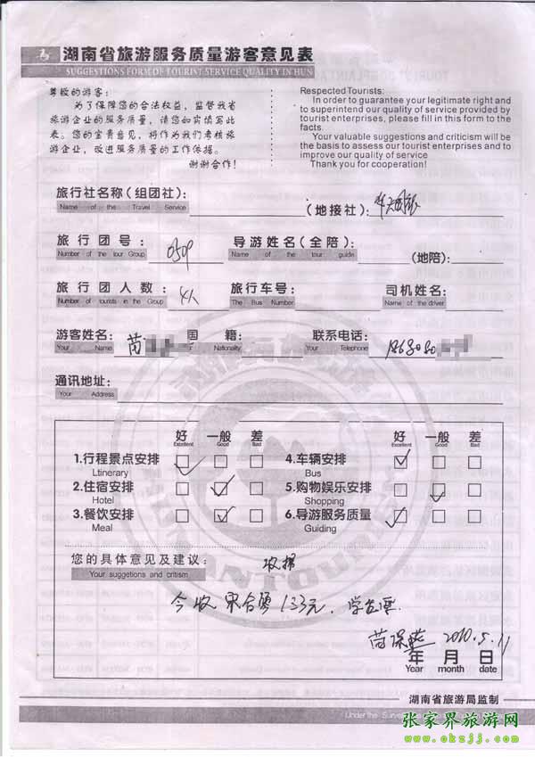 2010年5月11日苗小姐一行4位旅游質(zhì)量反饋