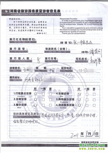 2011年8月16日王先生一行8人旅游質(zhì)量反饋:導(dǎo)游服務(wù)質(zhì)量優(yōu)秀、熱情,線路安排合理,住宿餐飲安排很好